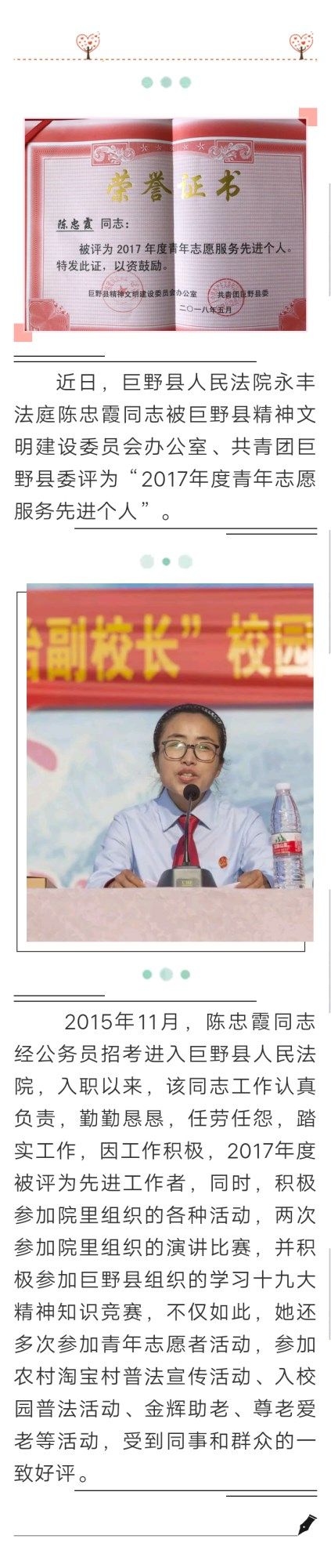 我院干警陈忠霞荣获巨野县“2017年度青年志愿服务先进个人”称号